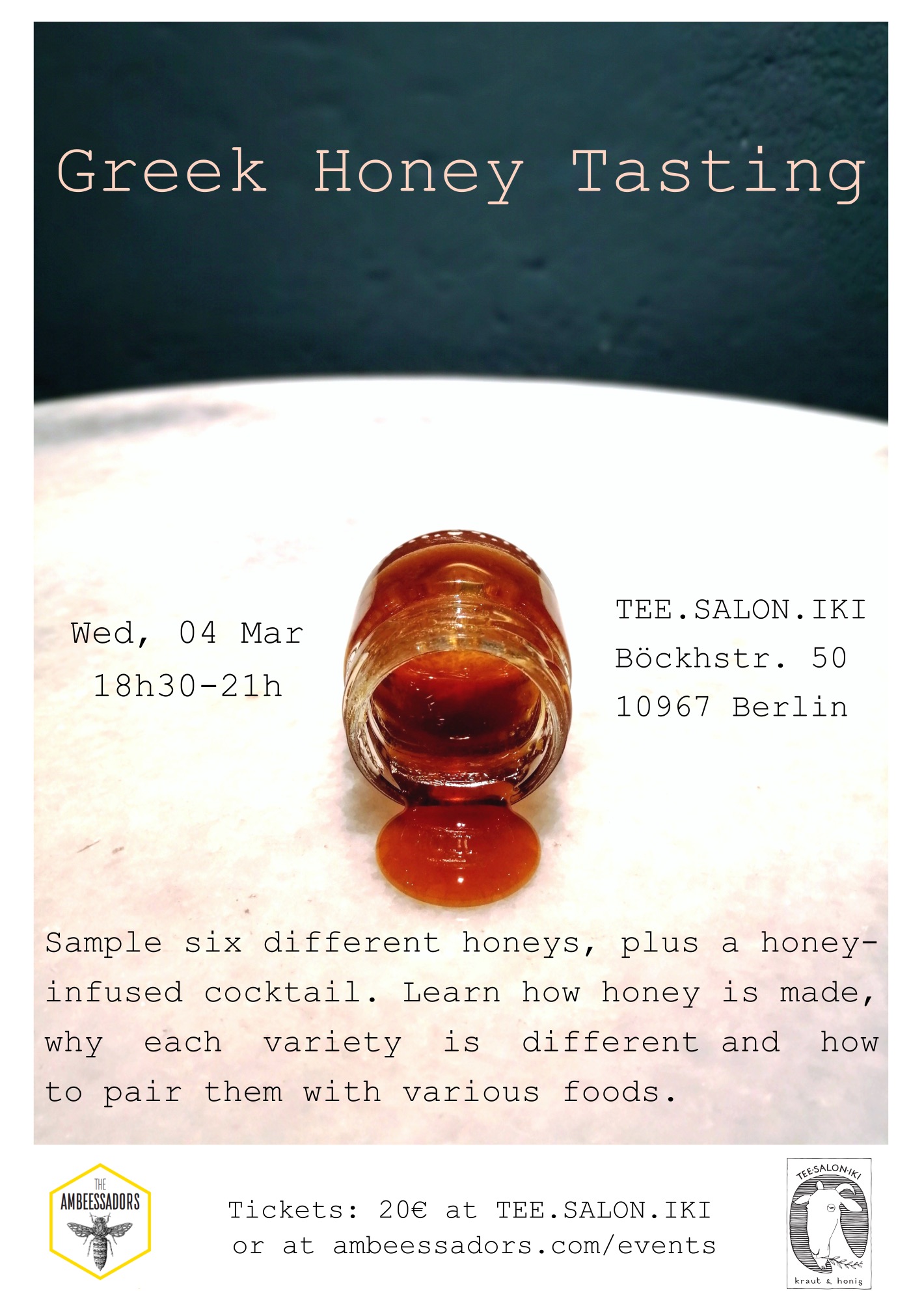 Experiential by nature, you'll be greeted with a seasonal honey-infused cocktail before meeting the intimate group in cozy TEE.SALON.IKI in Kreutzberg.Together we'll then journey through the ages and across continents, uncovering fascinating facts about bees and honey before playing sensorial games and tasting six small-batch Greek honeys.
