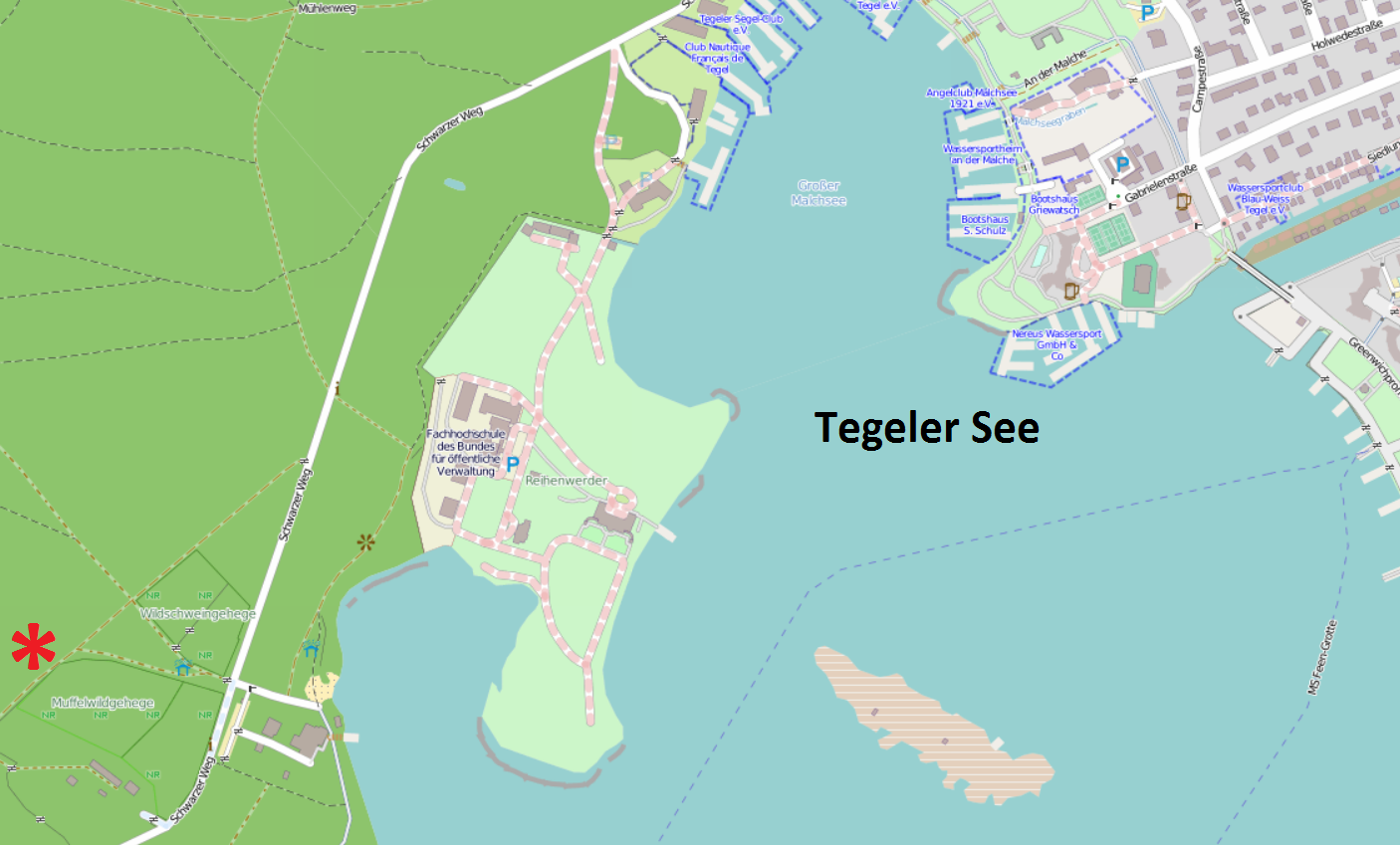 Anreise: Zum Belegstand kommt man am besten mit dem Fahrrad. Bitte fahren Sie entlang des „Schwarzen Wegs“ (Abbiegung hinter dem Restaurant „Alter Fritz“ von der Heiligenseer Str.) in Richtung der DLRG-Wasserrettungsstation/Restaurant Toulouse. Dort gibt es auch eine sehr begrenzte Zahl von Parkplätzen und ein WC-Häuschen. Dann entlang des Waldweges zwischen den Wildgehegen durch und an der Gabelung links haltend bis zum Belegstand – erkennbar an einem kleinen Holzhäuschen hinter dem Jägerzaun (* in der Karte).