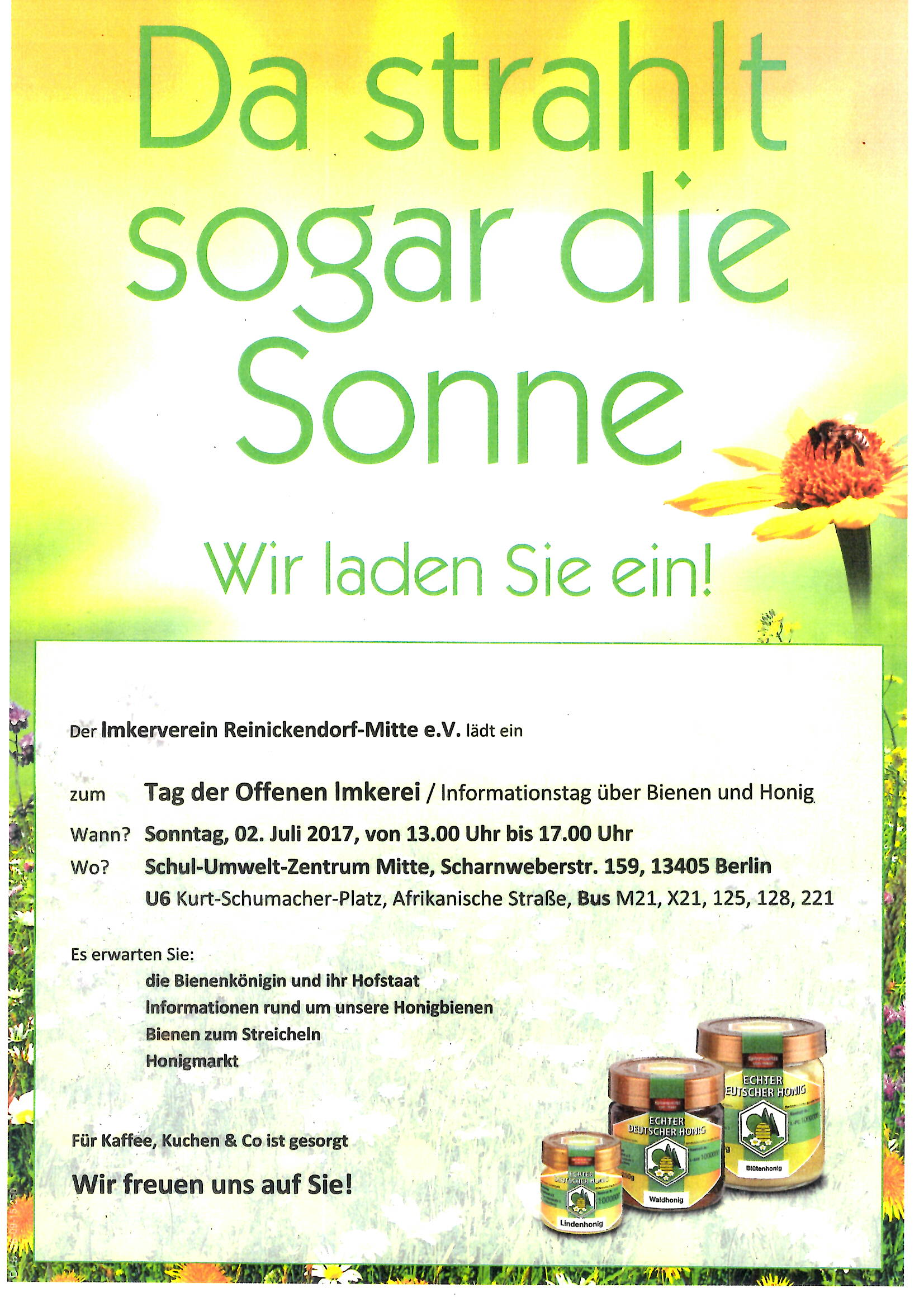 Bio-Würstchen frisch vom Grill, selbstgebackene Kuchen, Nisthilfenbau für Wildbienen, Rätselrally, Führungen, Tipps zu (wild)bienengerechten Gärten, regionales Saatgut für die eigenen Wildblumenwiese, Honige aus Reinickendorf und Mitte, Bienenhaltung in allen Formaten....
